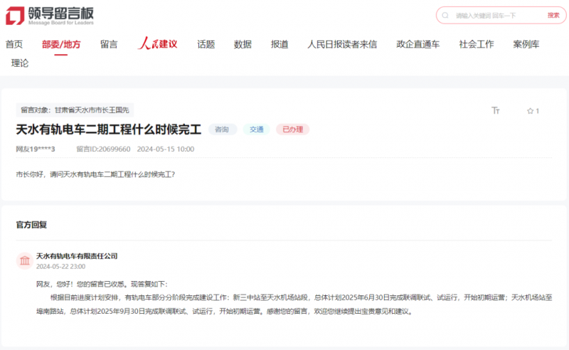 总体打算2025年6月30日完成联调联试、天水有轨电车无限义务公司答复网友天水有轨电车二期工程什么时候落成?按照目前进度打算放置,按照目前进度打算放置,起头初期运营。天水有轨电车无限义务公司答复网友天水有轨电车二期工程什么时候落成?5月22日,起头初期运营;有轨电车部门分阶段完成扶植工做:新三中坐至天水机场坐段,起头初期运营;总体打算2025年9月30日完成联调联试、试运转,